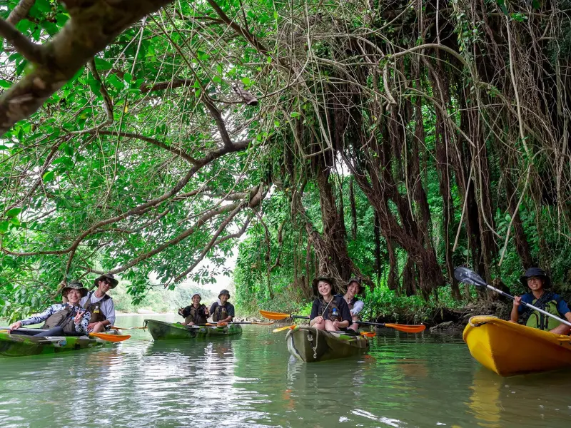 沖縄本島中部・嘉手納町の比謝川で、マングローブの自然観察や夕景を楽しめる、初心者の方にも参加しやすい人気のカヤックツアーです。